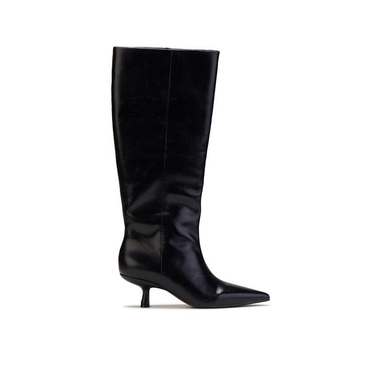 Μαύρο δερμάτινο, με ψηλά δάχτυλα και παπούτσια με ψηλά τακούνια.